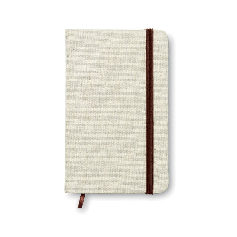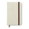 Cuaderno A6 con cubierta de lona dura. Encuadernado en cartoné. 192 páginas de papel reciclado rayado (96 hojas). Cinta elástica de cierre en contraste y cinta marcapáginas.
